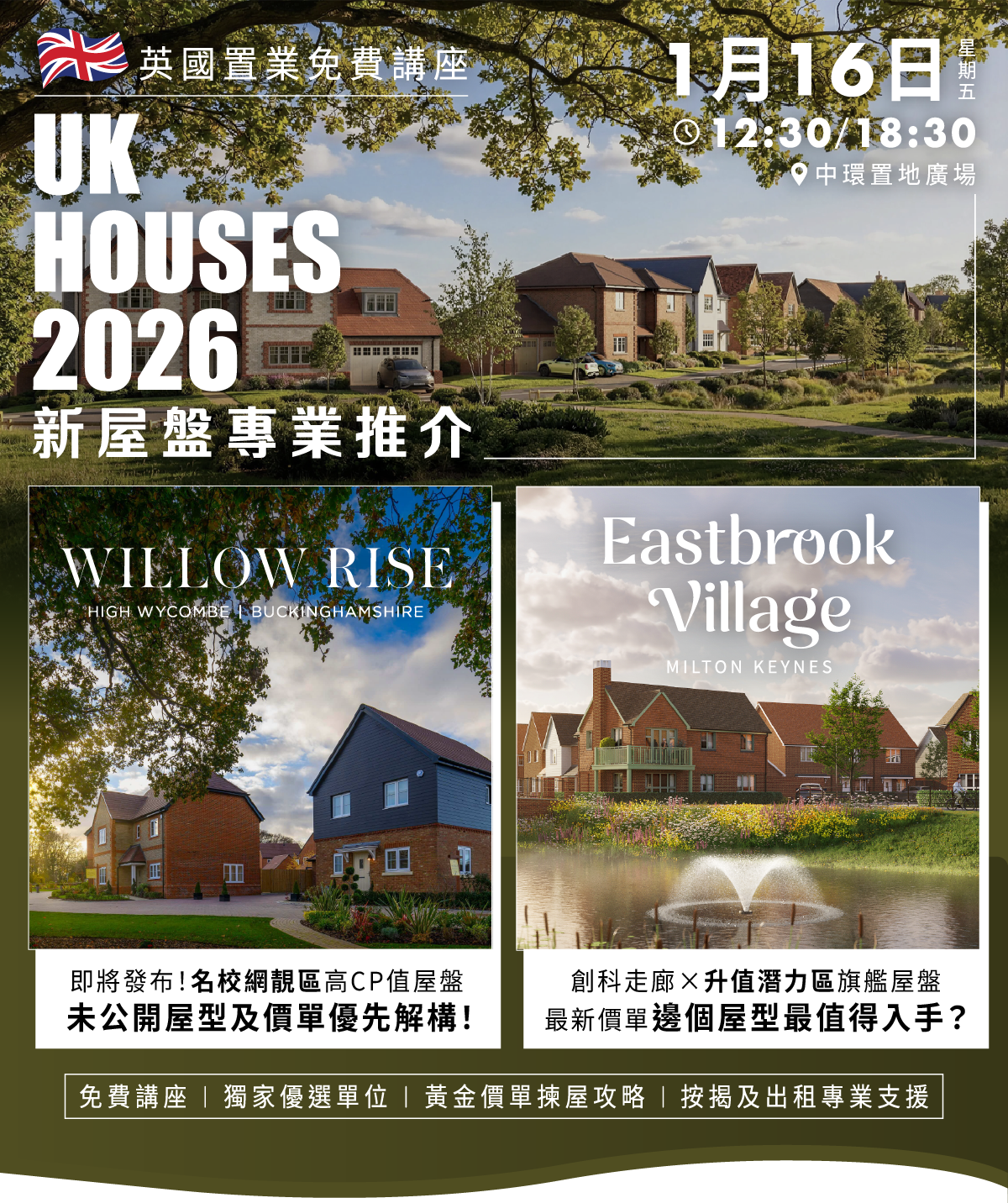 今次講座聚焦兩大 2026 年最受關注英國新屋盤,由 Elly 親自為你拆價單・揀屋型・講策略